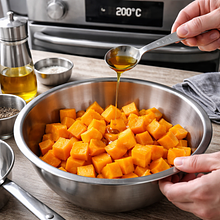 Preheat the oven to 200°C (top and bottom). In a large bowl, mix the pumpkin cubes with 15 ml of olive oil (half the amount listed in the ingredients), 1 g of salt, and 0.5 g of pepper. Spread evenly on a baking sheet lined with parchment paper in a single layer, so the pieces do not touch. Bake for 25-30 minutes, stirring with a spoon after 15 minutes, until the pumpkin is tender and starts to caramelize slightly (brown edges and softness when pierced with a knife).