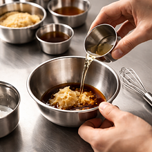 In a small bowl, combine 30 g of white miso, 30 ml of rice vinegar, 15 ml of soy sauce, 20 ml of sesame oil, 15 ml of lemon juice, 10 g of freshly grated ginger, and 10 g of finely chopped or minced garlic. Optionally, add 25 g of honey if you want to soften the flavor and balance the acidity (for vegans, substitute with maple syrup). Whisk or use an immersion blender for 10-15 seconds until the dressing becomes smooth and slightly creamy. Taste and adjust with 1 g of salt and 0.5 g of pepper if needed.