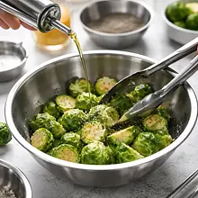 In a large bowl, drizzle half of the olive oil (about 15 g) and add 2 g of salt and 1 g of pepper. Toss in the Brussels sprouts and coat them thoroughly — you can use kitchen gloves or two spoons. Arrange them on a baking sheet lined with parchment paper, cut side down, in a single layer without overlapping.