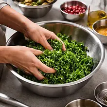 Before assembling, lightly 'massage' the kale: place 200 g of kale in a large bowl, add 5 g of olive oil and a pinch of salt, and with your hands, knead the leaves for 30–45 seconds until they soften and lose their raw roughness (the leaves should be shiny and more flexible). Add the cooled but still warm roasted Brussels sprouts, chopped pieces of persimmon, and 120 g of pomegranate seeds. Drizzle with 1/2 of the prepared dressing (about half the amount in the bowl) and gently mix with a large spoon or two to combine the ingredients, but do not crush the fruits.