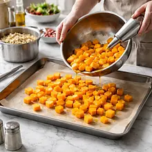 Transfer the chopped pumpkin to a large baking tray lined with parchment paper. Drizzle with 2/3 of the oil (30 g) and gently mix with your fingers or a silicone spatula, sprinkle with 2 g of salt (about 2 pinches) and 1 g of pepper (1 pinch). Spread the pieces out so they are not crowded. Bake for 25-30 minutes, stirring once halfway through — the pumpkin should be soft when pierced with a fork and slightly browned at the edges.
