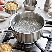In a medium pot, bring 320 ml of water (2 parts water to 1 part dry quinoa) to a boil over medium heat. Add the rinsed quinoa and a pinch of salt (about 1 g). Reduce the heat to low and cook covered for 12-15 minutes, until most of the water is absorbed. After this time, remove the pot from the heat and let it sit covered for another 5 minutes. Uncover and fluff the quinoa with a fork — the grains should be fluffy, and a delicate 'tail' (the germ?) of the grain will be visible. Spread onto serving plates to cool slightly (not hot).