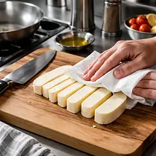 Cut the halloumi into slices 8-10 mm thick and pat dry with a paper towel. Heat a non-stick pan over medium heat, add 1 tablespoon of oil (15 g), and when hot, place the halloumi slices in the pan. Fry for 2.5-3.5 minutes on each side until a golden-brown, crispy crust forms. Once fried, transfer to a plate lined with paper towels to drain excess fat.
