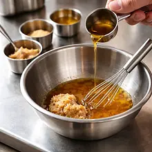 In a medium bowl, combine 40 g of white miso, 30 g of sesame oil, 30 g of rice vinegar, 20 g of honey, and 20 g of lemon juice. Add 2 crushed garlic cloves (10 g). Whisk vigorously with a fork or whisk until the dressing is smooth and uniform. If it's too thick, add 1-2 tablespoons of water (15-30 g) and mix again. Season with 2 g of salt and 1 g of pepper to taste — remember that miso is salty.