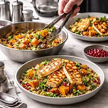 A colorful fusion salad combining the sweetness of roasted butternut squash and kaki (persimmons) with salty halloumi, crunchy hazelnuts, and juicy pomegranate seeds. The base of cooked quinoa adds a hearty character, while the creamy-spicy miso-sesame dressing gives an Asian-Mediterranean touch. The dish is seasonal (autumn/winter), visually striking due to the color contrasts: the deep orange of the squash, the ruby of the pomegranate, the bright slices of kaki, and the golden pieces of halloumi. Serve on fresh spinach leaves or a mix of greens, as a light lunch or an exquisite appetizer for dinner. The salad combines different textures: soft quinoa and squash, crunchy nuts, and fresh herbs — it tastes great warm or after a brief chill.