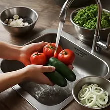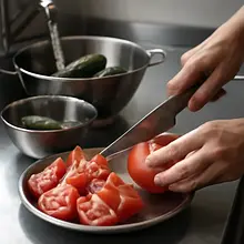 PREPARING VEGETABLES: Wash the tomatoes and cucumber thoroughly under running water. Cut the tomatoes into large pieces, preferably into eighths, to preserve their juiciness. Peel the cucumber if it is bitter, and slice it into thick half-moons.
