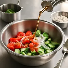 FINISHING THE SALAD: Gently mix all the ingredients so that the dressing evenly coats the vegetables and cheese. Transfer the salad to a decorative bowl and serve immediately.