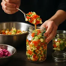 Vegetable salad in jars is a crunchy, colorful mix of fresh vegetables preserved in a delicate, slightly sweet and sour marinade. Perfect as a Christmas Eve treat — it enhances the flavor of other dishes, is convenient to store, and looks appealing when served (jars with layers of colors). The recipe combines traditional preservation techniques with an easy-to-make marinade based on apple cider vinegar and oil, resulting in a pleasant texture (crunchy carrots and peppers, softer cabbage). Excellent as an appetizer for Christmas Eve, for sandwiches later, or as a side dish for fish dishes; it looks very decorative when the layers of vegetables are clearly visible in transparent jars.