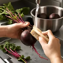 If you are using raw beets: wash them under running water with a brush, trim the ends (you can save the leaves for another dish), and dry. You have two options: boiling or roasting. Boiling: place the beets in a large pot, cover with cold water so that the water covers them, add 1 teaspoon of salt (about 5 g), bring to a boil, then cook over medium heat for 40-60 minutes (time depends on size; smaller ones 30-40 minutes). Check with a fork — it should go into the beet smoothly without resistance. Roasting: preheat the oven to 200°C, wrap each beet in aluminum foil or place in a baking dish with a little olive oil, roast for 45-60 minutes until soft (fork test). After cooking/roasting, set aside to cool for 15-20 minutes.