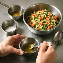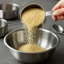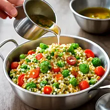 Measure 200 g of dry couscous and pour it into a medium bowl with a capacity of about 2 liters. Boil 240 ml of water (or hot vegetable broth) in a kettle or pot. Pour the hot water evenly over the couscous to completely moisten it. Gently mix with a fork for 10–15 seconds, then cover the bowl with a plate or cloth and set aside for 8–10 minutes, until the couscous absorbs the liquid.