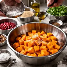 Place the chopped pumpkin in a large bowl, drizzle with 2 tablespoons (30 g) of olive oil, sprinkle with 1 g of salt, and gently mix with your hand or a silicone spatula to coat each piece. Spread the pumpkin on a large baking sheet lined with parchment paper, arranging the pieces in a single layer without overlapping. Bake in the preheated oven for 20–25 minutes, stirring the pumpkin with a spatula halfway through — it will be ready when the edges of the cubes are slightly browned and the center is soft (check with a fork: it should go in easily but not fall apart completely). Remove and set aside to cool slightly.