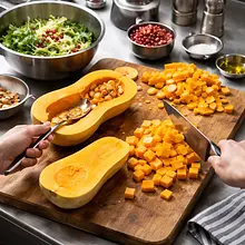 A traditional, seasonal salad that combines the sweetness of roasted butternut squash with the anise aroma of fennel and the juicy tartness of pomegranate. The dish is colorful and eye-catching thanks to the orange pieces of squash, red pomegranate seeds, and fresh greens. Perfect as a light dinner on its own, an appetizer for a winter family gathering, or a side dish to roasted meat. The salad combines textures: soft, caramelized squash, crunchy fennel, creamy nuts, and a bold honey-mustard dressing that balances sweetness and acidity. Served on a flat platter, it looks impressive and appetizing.