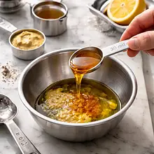 In a small bowl or jar, combine the remaining olive oil (15 g), honey (30 g), Dijon mustard (15 g), lemon juice (remaining 15 ml), minced garlic (5 g), salt (2 g), and pepper (to taste). Mix with a fork or screw on the jar lid and shake vigorously for 20-30 seconds until the ingredients are combined and the dressing becomes slightly glossy and emulsified. Taste and adjust seasoning with salt/pepper if needed.