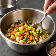 Prepare the vegetables for cooking: thoroughly wash the potatoes and carrots under running water. Peel the potatoes and carrot with a vegetable peeler (if you are using young potatoes, you can leave the skin on, but make sure to scrub them well). Cut the potatoes into pieces about 2–3 cm on each side (a cube of 1.5–2 cm is optimal for even cooking). Slice the carrot into rounds or half-moons about 5 mm thick, so they cook in a similar time.
