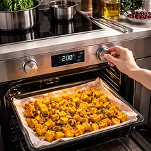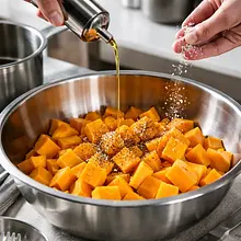 Preheat the oven to 200°C (top-bottom) with the convection option, if you have it. Prepare a baking sheet lined with parchment paper. Peel the butternut squash with a fork or knife, cut it in half, remove the seeds with a spoon, and then cut the flesh into cubes about 2 cm on each side (uniform pieces bake evenly). Place the squash pieces on the baking sheet in a single layer — do not stack them.