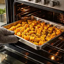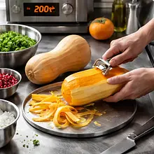 Preheat the oven to 200°C (top and bottom heat, no fan) or 190°C with fan. Peel the pumpkin with a peeler, cut off the ends, slice it in half lengthwise, and remove the seeds with a spoon. Cut the flesh into cubes about 2 cm on each side so that the pieces roast evenly. Transfer the pumpkin to a large baking tray lined with parchment paper.