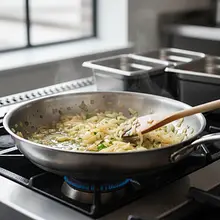 Peel the onion and chop it into very small cubes. In a large skillet (preferably about 28 cm in diameter), heat the clarified butter over medium heat. When the butter is hot, add the chopped onion and sauté, stirring occasionally, for about 5-7 minutes, until it becomes soft and translucent, but not browned.