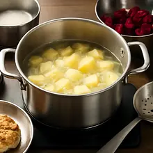 Peel the potatoes, cut them into pieces, and cook in salted water for 20 minutes until soft.
