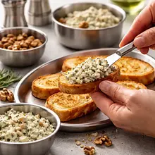 Store separately: cheese in the fridge for 3–4 days (wrapped in wax paper or loose in a container), roasted nuts in an airtight container for up to 7 days, and it's best to consume the baguette the same day. Prepared assembled crostini are not suitable for long storage — they lose their crunch. If you need to prepare in advance, prepare the ingredients separately and assemble just before serving.