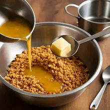 Combine: transfer the crushed biscuits to a large bowl, pour in the melted butter and 2 tablespoons (about 30 g) of peanut butter (use the remaining peanut butter for the filling and caramel). Stir with a spoon or spatula until all the crumbs are moist and the mixture starts to clump together - about 1-2 minutes. The mixture should slightly stick to your finger when you press it.
