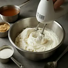 Whip the cream: in a separate, well-chilled bowl, whip 200 ml of 30% cream to soft peaks (about 2-3 minutes on medium speed). Indication: when you turn the bowl slightly upside down, the cream should not run off, and the surface will be wavy but not stiff.