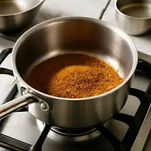 Prepare the caramel: in a small saucepan over medium heat, add 80 g of brown sugar and heat without stirring for 3-5 minutes, until the sugar starts to melt and takes on an amber color. Once most of the sugar has dissolved, add 40 g of butter (part of the previously measured butter) and stir with a wooden spoon until combined (about 1 minute). Note: greasy bubbles may splatter.
