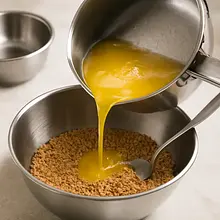 Melt 100 g of butter in a small pan or saucepan, remove from heat and pour into a bowl with the crushed biscuits. Mix with a spoon until the mixture is uniform and slightly moist — it should hold together when you take some in your hand and press it.