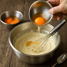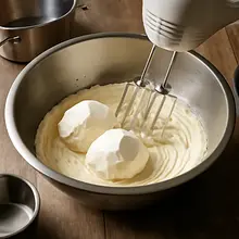Add one egg at a time (a total of 180 g — one after the other), mixing briefly after each addition just until combined. After adding the eggs, fold in 200 ml of heavy cream and 20 g of potato starch dissolved in 1–2 tablespoons of cooled espresso (set aside 10–15 ml of the 30 ml espresso for diluting the starch).