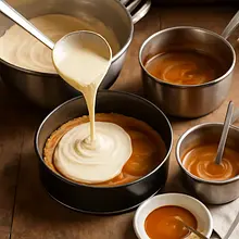 Pour about 2/3 of the cheese mixture onto the chilled base. To the remaining 1/3 of the mixture, add 120 g of dulce de leche and 10–15 ml of espresso, gently mix to create a creamy, slightly coffee-flavored dulce de leche mixture.