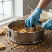 Preheat the oven to 180°C (top and bottom heat). Prepare a 24 cm round cake pan. Line the bottom of the pan with parchment paper, securing it with the rim. Do not grease the sides - this will help the cheesecake rise evenly and not collapse on the sides.