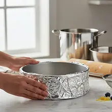 After baking, turn off the oven, slightly ajar the door (you can place a wooden spoon in it) and leave the cheesecake in the cooling oven for at least an hour. Then, remove it from the oven and the water bath, gently peel off the foil, and leave it on the kitchen counter to cool completely (another 1-2 hours).