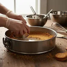 Preheat the oven to 180°C (fan) or 190°C (top-bottom). Prepare a 24 cm diameter springform pan. Place the digestive biscuits in a strong ziplock bag and crush them into fine crumbs using a rolling pin or a meat mallet. You can also use a food processor or a blender. The finer you crush the biscuits, the firmer the base will be.
