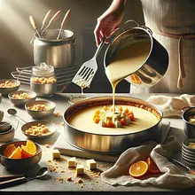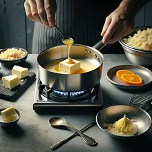 Prepare the glaze once the cheesecake is cooled: in a small saucepan, melt 30 g of butter over low heat, add 50 g of powdered sugar and 60 ml of orange juice. Stir evenly until the sugar is completely dissolved and the mixture becomes smooth and slightly thickened (about 2–3 minutes over low heat). Do not bring to a boil for a long time; we just want to combine the ingredients and slightly reduce the juice.
