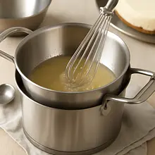 After soaking, heat the gelatin: place the bowl with gelatin over a pot of hot (but not boiling) water or heat in the microwave for 8–10 seconds until the gelatin becomes liquid and clear. Stir with a teaspoon — do not let it boil, as this will destroy the properties of the gelatin. After dissolving, set aside for 1–2 minutes to cool down.