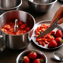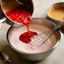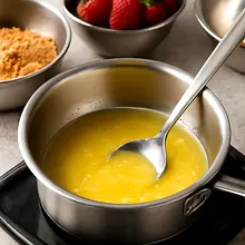 Prepare the coulis: if you have 300 g of blended strawberries (step 9), pour them into a small saucepan and heat for 1-2 minutes, stirring, until it thickens slightly. If you prefer the raw version, you can skip heating the puree. Let the coulis cool slightly to room temperature. Alternative: heat 50 g of strawberry jam with 1 tablespoon of water and strain to achieve a glossy glaze.