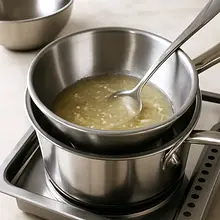 Dissolve the gelatin: transfer the bowl with the swollen gelatin to a water bath or heat in the microwave for 8-12 seconds, stirring until the solution is clear — do not let it boil. The solution should be lump-free and have a temperature of about 40°C (slightly warm). Set aside to cool slightly — it should be warm, not hot.
