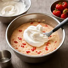 Combine everything with the whipped cream: fold the whipped white fluffy peaks of cream into the cheese-strawberry mixture in 3-4 batches. Gently fold with a spatula from the bottom of the bowl upwards, turning the bowl — the pace should be slow to avoid losing fluffiness. Once the mixture is uniform, add 100 g of finely chopped strawberries (if you want pieces) and gently mix.