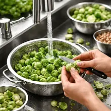 Wash the Brussels sprouts under running cold water. Trim the tough ends (about 2-3 mm) and remove any damaged outer leaves. Stack the Brussels sprouts on top of each other and, using a sharp knife, cut them in half lengthwise, then lay them flat and shred them very thinly (or use a mandoline with a thin slicing blade). Transfer the resulting thin slices to a large bowl.