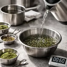 Brew green tea: boil 800 ml of water, let it sit for 60 seconds to cool down to about 80°C (hot, but not boiling). Add matcha (12 g) to a small bowl, pour in 50 ml of hot water, and vigorously whisk with a bamboo whisk or a small whisk until a smooth, thick, green paste without lumps forms.