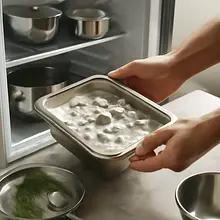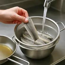 Check the herring fillets: if they are in oil, drain it and rinse briefly under cold running water. If they are salted (matjas), place the fillets in a large bowl and cover them completely with cold water. Put the bowl in the refrigerator for 1–3 hours, changing the water every 30–60 minutes. After 1 hour, taste a small piece; if it is still too salty, continue soaking. If you want to speed up the sweetening process, you can replace the water with milk and soak for 30–60 minutes — milk softens the salt and adds creaminess.
