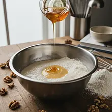 Start by preparing the starter, which means 'activating' the yeast. In a small bowl or cup, place the crumbled fresh yeast. From the total amount of water (300 ml), pour out about 100 ml, ensuring it is pleasantly warm (not hot!). Pour it over the yeast. Add one tablespoon of honey from the measured amount and one tablespoon of spelt flour. Mix everything thoroughly with a small whisk or fork until the yeast is completely dissolved and a smooth, liquid mixture forms. Cover the bowl with a clean cloth and set it in a warm, draft-free place (e.g., near a radiator or in a slightly warmed oven) for about 10-15 minutes. The ready starter should significantly increase in volume and be covered with a thick foam - this is a sign that the yeast is active and ready to work.