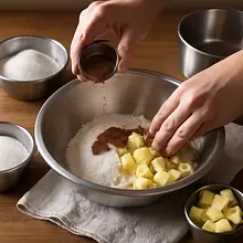 Prepare the crumble: in a bowl, combine 40 g of flour, 40 g of white sugar, and 40 g of cold butter cut into cubes (remove 40 g of the butter, the rest will be used for the dough). Add 2 g (0.4 teaspoon) of cinnamon (part of the total amount). Rub with your fingers or use two knives until clumps form that resemble wet sand and pea-sized pieces. The crumble should hold together in clumps when squeezed in your hand.