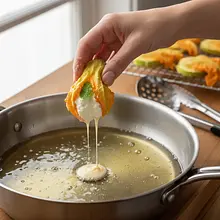 Preparing zucchini flowers requires extraordinary delicacy. Take each flower individually and gently open its petals. Check to see if there are any insects inside. Then, using your fingers or a small tweezers, carefully remove the stamen (pistil) inside - it can be bitter in taste. Try not to tear the delicate petals. Do not wash the flowers under running water, as they are too fragile. Instead, gently wipe them with a damp paper towel. Set them on a dry paper towel to dry completely.