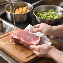 Remove the pork loin, rinse it quickly under cold water, and dry it with a paper towel. Place the pork loin on a cutting board and divide it into 4 equal parts (about 200 g each). If you have thick slices, gently pound each piece with your hand to achieve an even thickness. Then, rub each cutlet evenly with 1.5 g of salt (use about 6 g of salt in total for the meat) and freshly ground pepper on both sides. Spread 7-8 g of mustard on each side (30 g in total) and thinly distribute finely chopped garlic (2 cloves = 10 g). Set aside for 10-15 minutes at room temperature to allow the mustard to gently penetrate the meat (dry marinade).