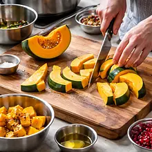 Preheat the oven to 200°C (fan 190°C). Prepare the kabocha: place the squash on a cutting board, cut it in half with a sharp knife, and scoop out the seeds with a spoon (you can set them aside to roast separately). Cut the halves into slices, then into cubes with sides of 2-3 cm — the skin of Hokkaido is edible after roasting, so do not peel it. Place the chopped squash in a large bowl.