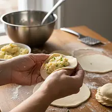 Now the most important moment: shaping. Fold the circle in half, enclosing the filling inside, creating a crescent shape. Use your fingers to press the edges of the dough very tightly to eliminate air bubbles. Then, to ensure that the dumpling doesn't open, you can press the edges with a fork or create a decorative ruffle. To make it, start at one corner, fold a small piece of the edge inward and press, moving along the entire seam.