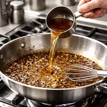 Increase the heat slightly and pour in the cognac (optional) into the pan — about 30 ml — and immediately deglaze, scraping the browned bits from the bottom with a wooden spoon. Allow the alcohol to evaporate for about 30–45 seconds; if you wish, you can carefully ignite it (flambé) — the flame will extinguish quickly and leave behind the aroma. If you are not using cognac, skip this step and pour in the beef broth right away.
