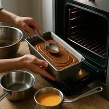 Transfer the mixture to the prepared loaf pan, smooth the top with a damp spoon. Place in the preheated oven and bake at 170°C for 50-60 minutes. After 40 minutes, check with a toothpick — it should come out with a few crumbs, but not raw batter. If the top is browning too much, cover it with aluminum foil.