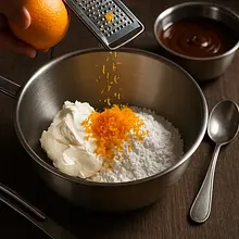 In a bowl, place the chilled mascarpone (250 g) and powdered sugar (80 g). Add the grated zest of fresh orange (10 g) and orange juice (30 ml). Beat with a mixer on low speed for 1-2 minutes until the cream is smooth and uniform. Place the cream in the refrigerator for at least 30 minutes to thicken.