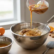 In a small saucepan, place fresh cranberries, juice squeezed from half an orange, 50g of brown sugar, and a cinnamon stick. Heat over medium power, stirring until the sugar dissolves. Bring to a boil, then reduce the heat and cook for 10-15 minutes, until the cranberries start to burst and the sauce thickens. Set aside to cool completely. Before using, remove the cinnamon stick.
